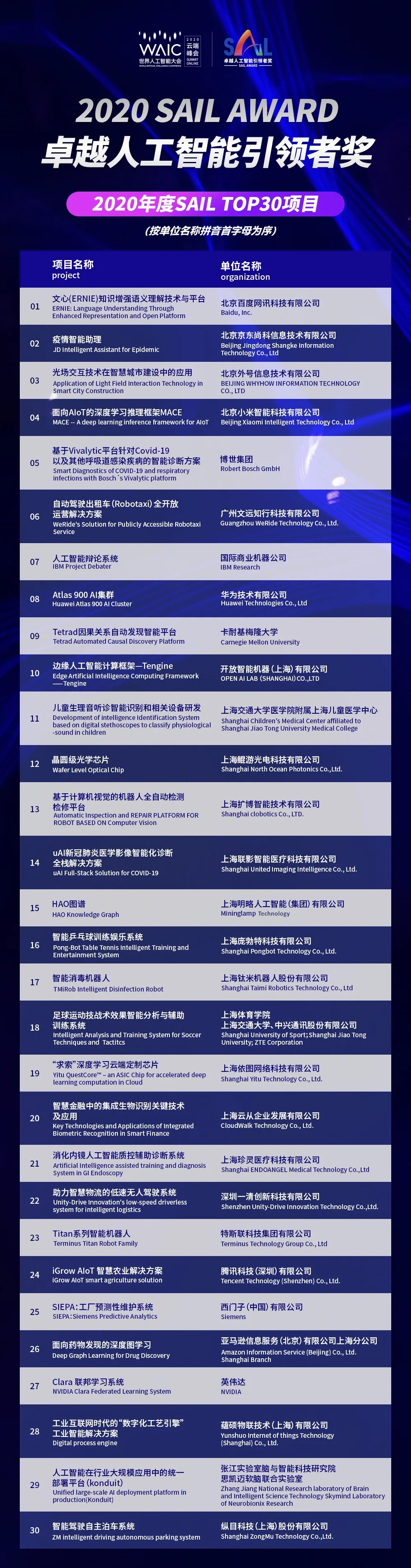 今年5月18日SAIL獎提名工作啟動以來,得到了業界、學界和投資界的高度關注。經過緊鑼密鼓地征集、初審、初評、復評,入圍2020SAIL獎TOP30的項目新鮮出爐。